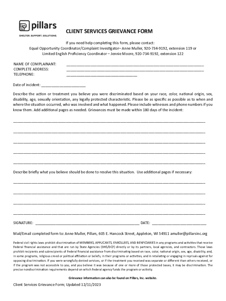 Get the free CLIENT SERVICES GRIEVANCE FORM