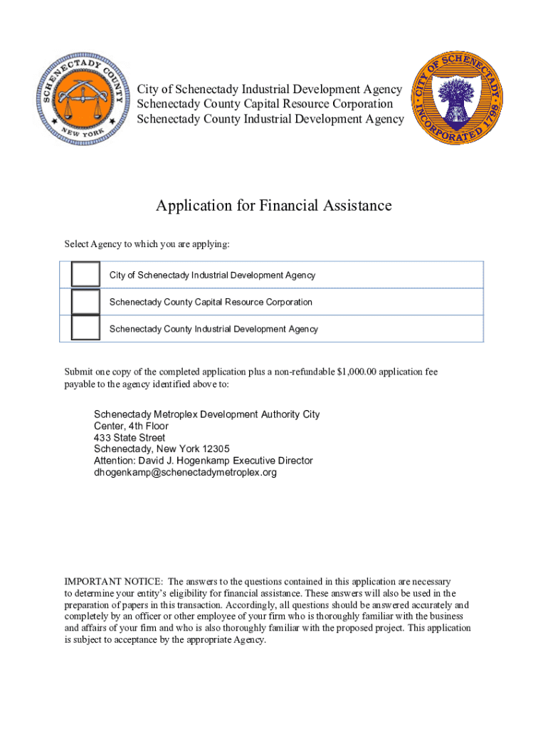 City of Schenectady Industrial Development Agency Schenectady County Capital Resource Corporation Schenectady County Industrial Development AgencyApplication for Financial Assistance Select Agency