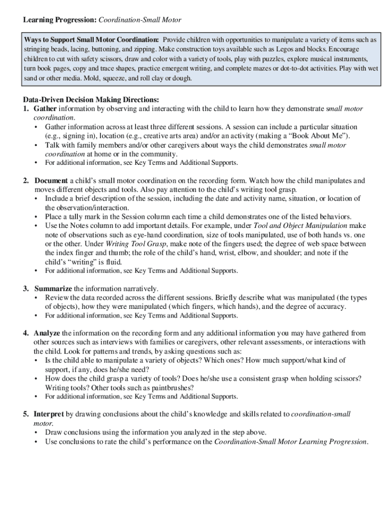 Learning Progression: CoordinationSmall Motor Ways to Support Small Motor Coordination: Provide children with opportunities to manipulate a variety of items such as stringing beads, lacing, buttoning,