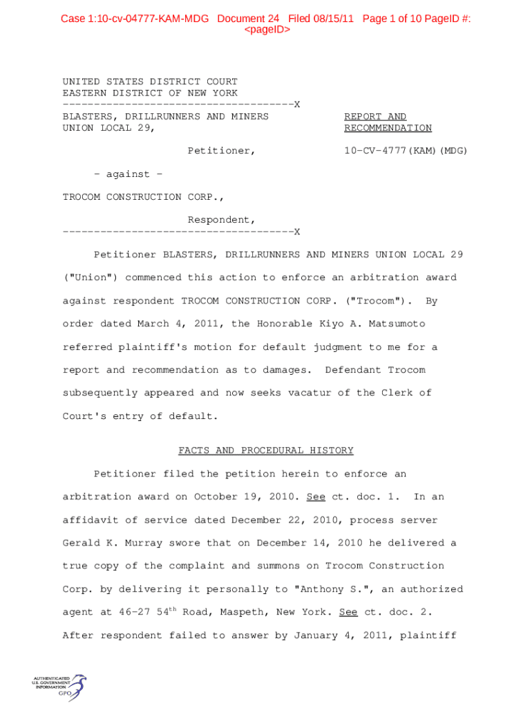 Case 1:10cv04777KAMMDG Document 24 Filed 08/15/11-Page 1 of 10 Paged #: pageIDUNITED STATES DISTRICT COURT EASTERN DISTRICT OF NEW YORK X BLASTERS, DRILLRUNNERS AND MINERS UNION LOCAL 29, Petitioner,