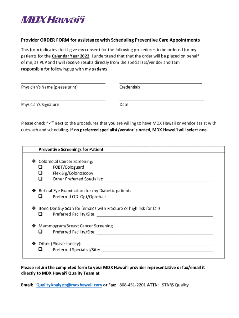 Provider ORDER FORM for assistance with Scheduling Preventive Care Appointments This form indicates that I give my consent for the following procedures to be ordered for my patients for the Calendar