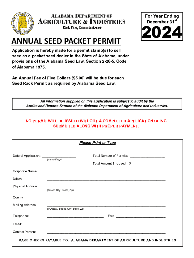 For Year Ending December 31stRick Pate, CommissionerANNUAL SEED PACKET PERMIT2024Application is hereby made for a permit stamp(s) to sell seed as a packet seed dealer in the State of Alabama, under