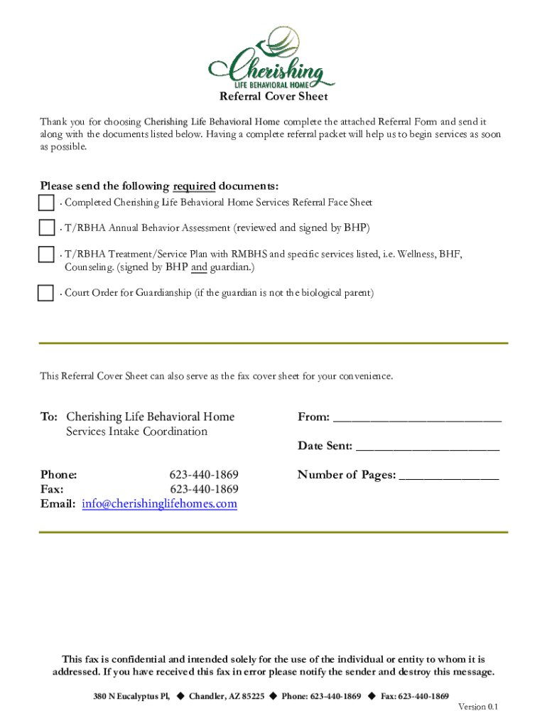 Referral Cover Sheet Thank you for choosing Cherishing Life Behavioral Home complete the attached Referral Form and send it along with the documents listed below. Having a complete referral packet