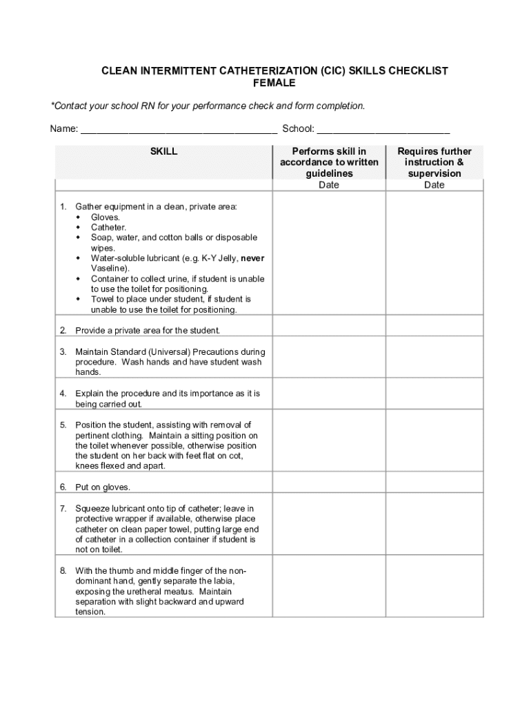 Get the free clean intermittent catheterization (cic) skills checklist female
