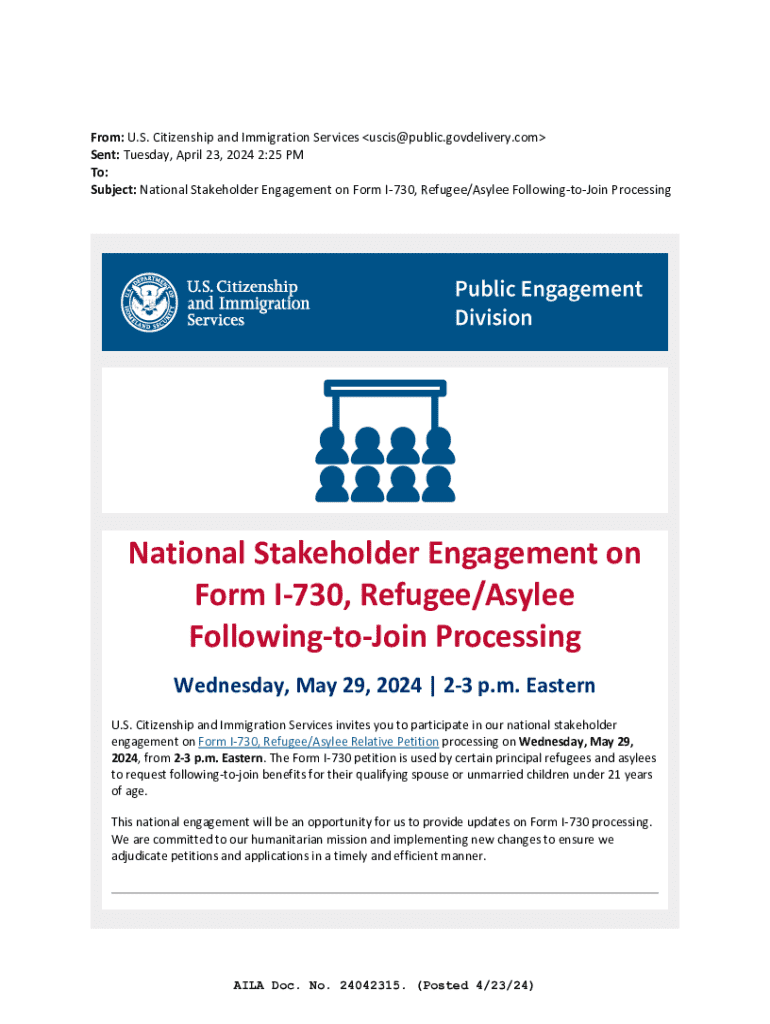 Subject: National Stakeholder Engagement on Form I730, Refugee/Ashlee FollowingtoJoin