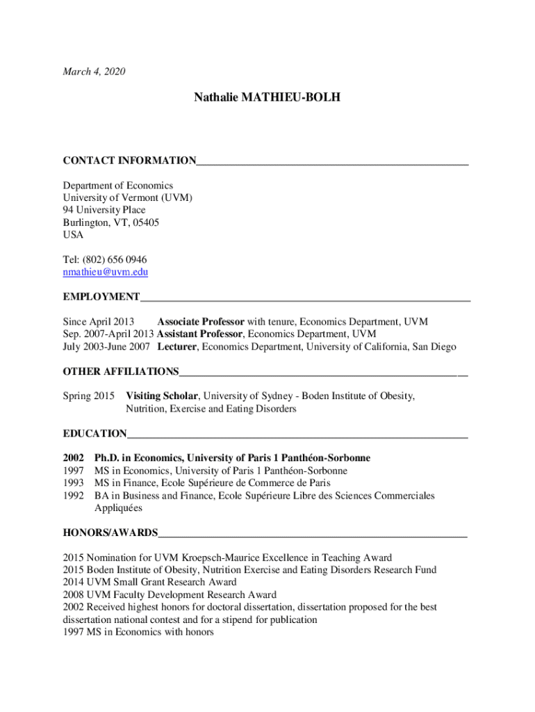 March 4, 2020Nathalie MATHIEUBOLHCONTACT INFORMATION___ Department of Economics University of Vermont (UVM) 94 University Place Burlington, VT, 05405 USA Tel: (802) 656 0946 nmathieu@uvm.edu EMPLOYMENT___