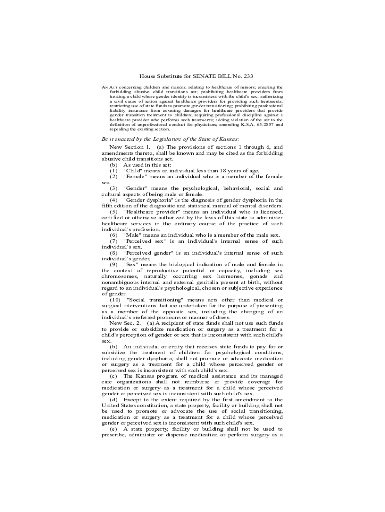House Substitute for SENATE BILL No. 233 AN ACT concerning children and minors; relating to healthcare of minors; enacting the forbidding abusive child transitions act; prohibiting healthcare providers