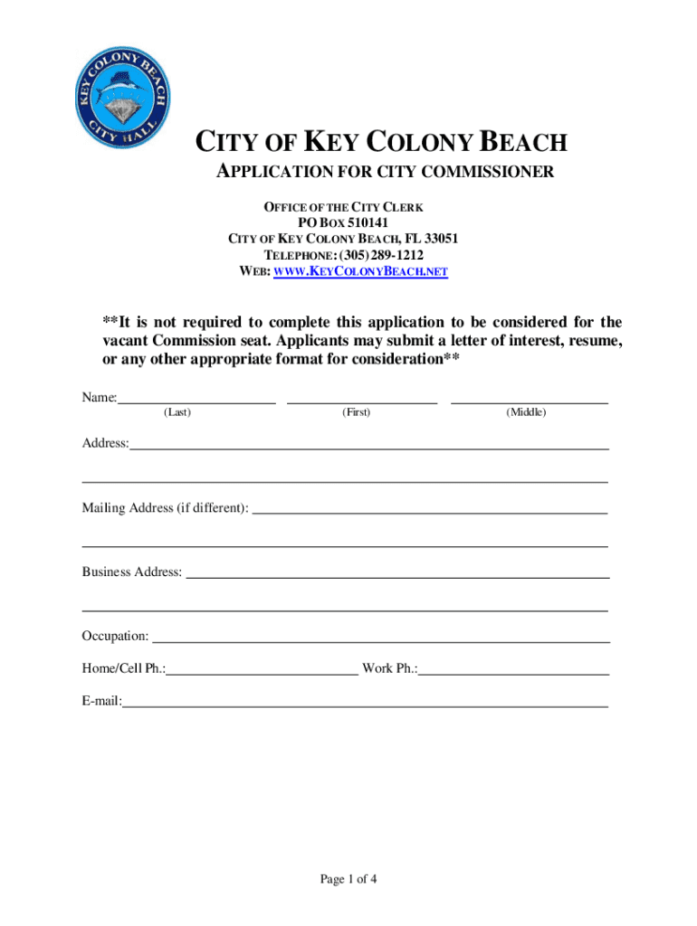 Obtain the city of Key Colony form either online or in person at the city office.