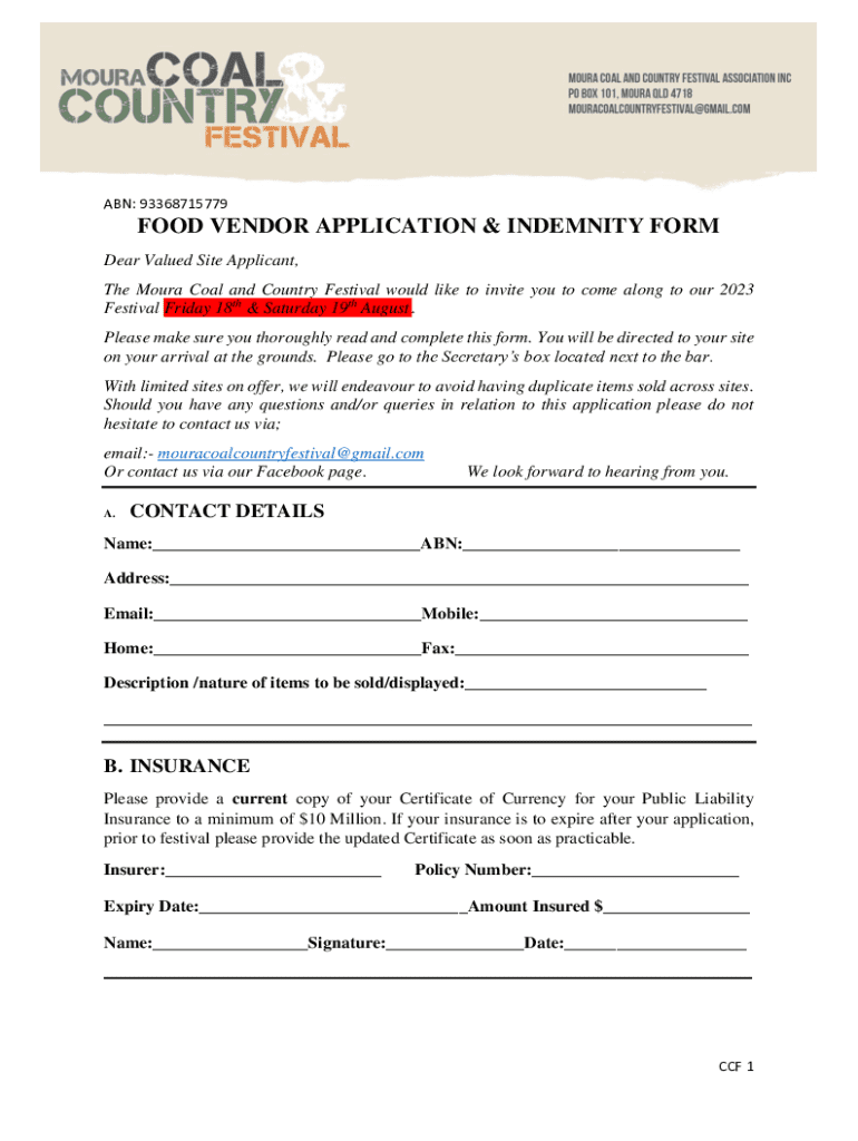 ABN: 93368715779FOOD VENDOR APPLICATION & INDEMNITY FORM Dear Valued Site Applicant, The Moura Coal and Country Festival would like to invite you to come along to our 2023 Festival Friday 18th & Saturday
