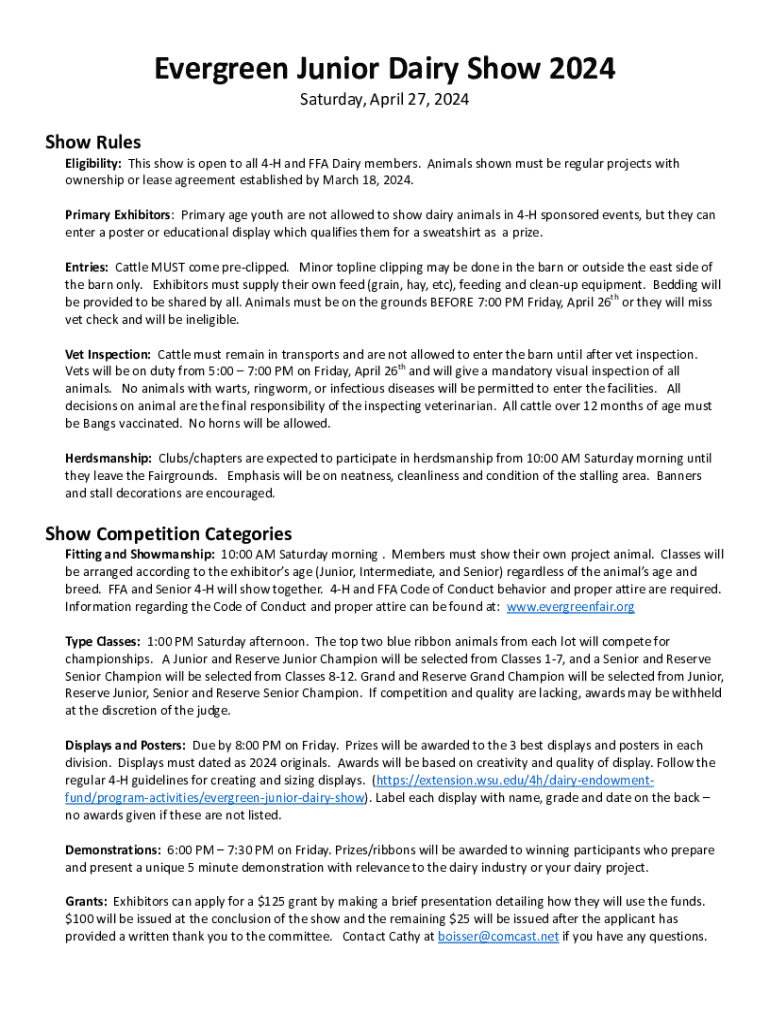Eligibility: This show is open to all 4H and FFA Dairy members. Animals shown must be regular projects with