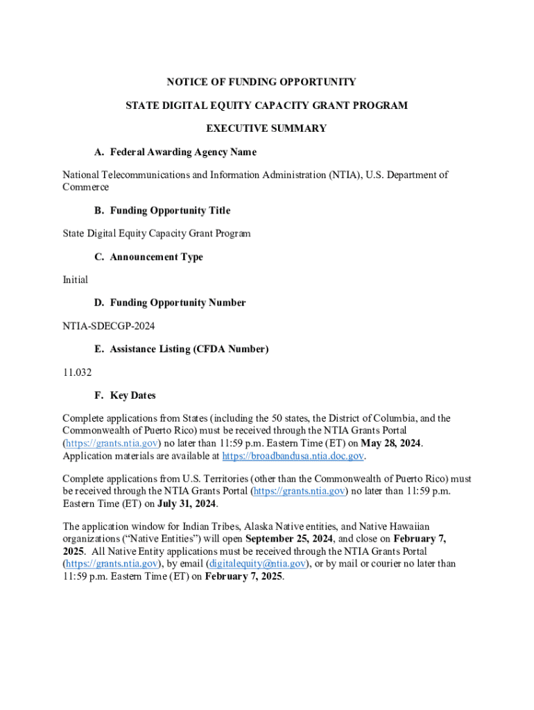 NOTICE OF FUNDING OPPORTUNITY STATE DIGITAL EQUITY CAPACITY GRANT PROGRAM EXECUTIVE SUMMARY A. Federal Awarding Agency Name National Telecommunications and Information Administration (TIA), U.S. Department