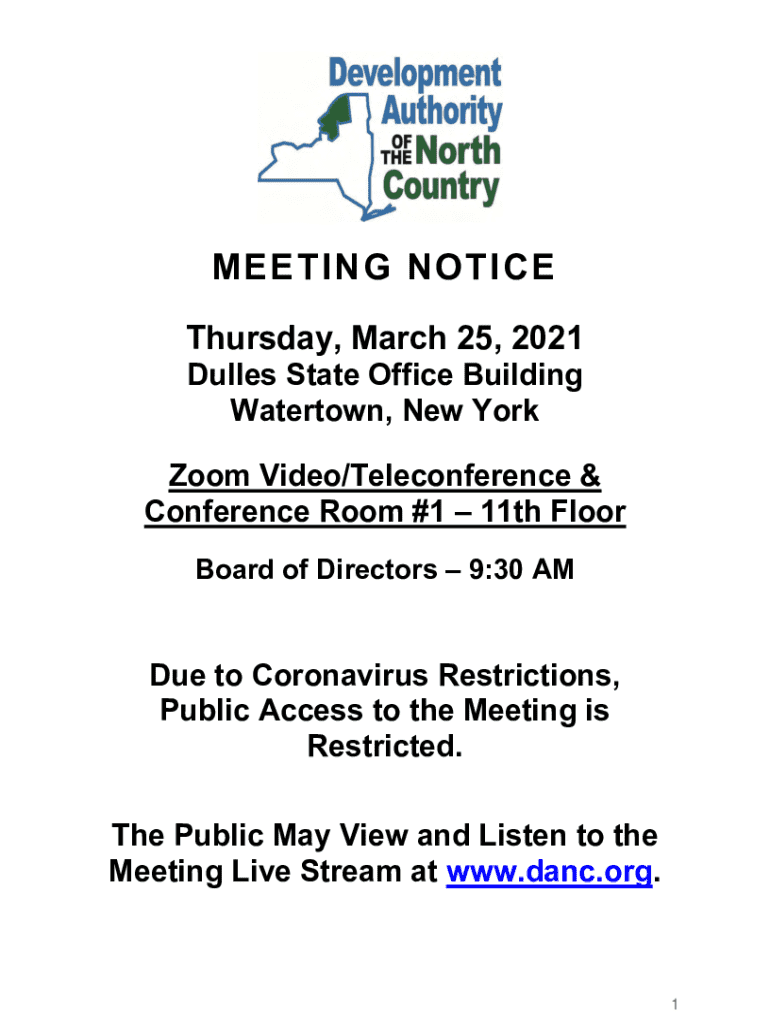 Board of Directors 9:30 Due to Coronavirus Restrictions,