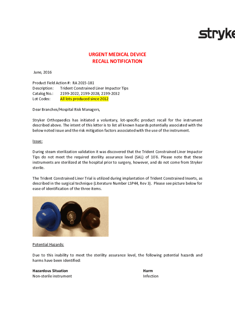 URGENT MEDICAL DEVICE RECALL NOTIFICATION June, 2016 Product Field Action #: RA 2015181 Description: Trident Constrained Liner Impactor Tips Catalog No.: 21992022, 21992028, 21992032 Lot Codes: All