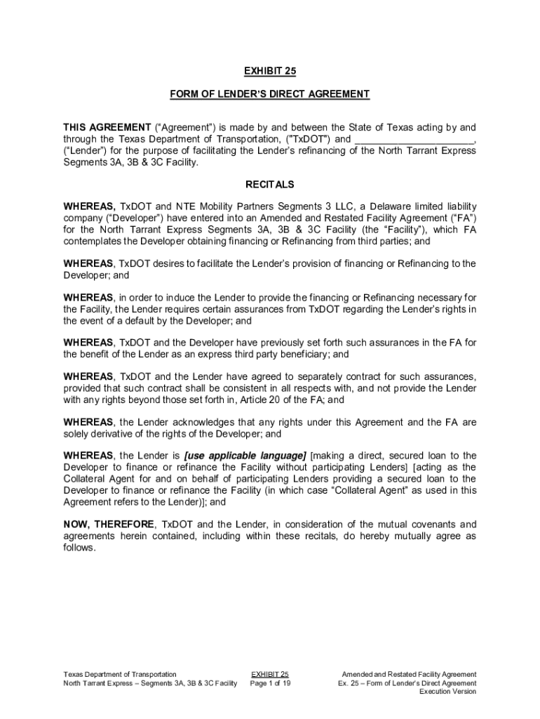EXHIBIT 25 FORM OF LENDERS DIRECT AGREEMENT THIS AGREEMENT (Agreement) is made by and between the State of Texas acting by and through the Texas Department of Transportation, (\”Dot\”) and ___,