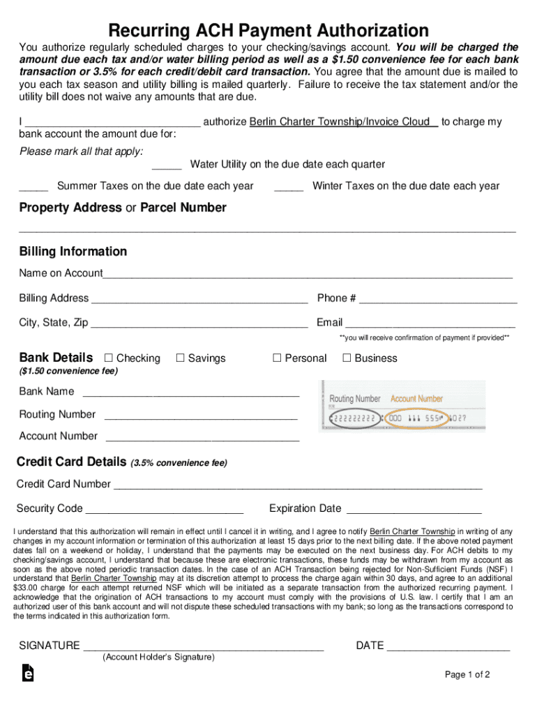 Recurring ACH Payment Authorization You authorize regularly scheduled charges to your checking/savings account. You will be charged the amount due each tax and/or water billing period as well as a