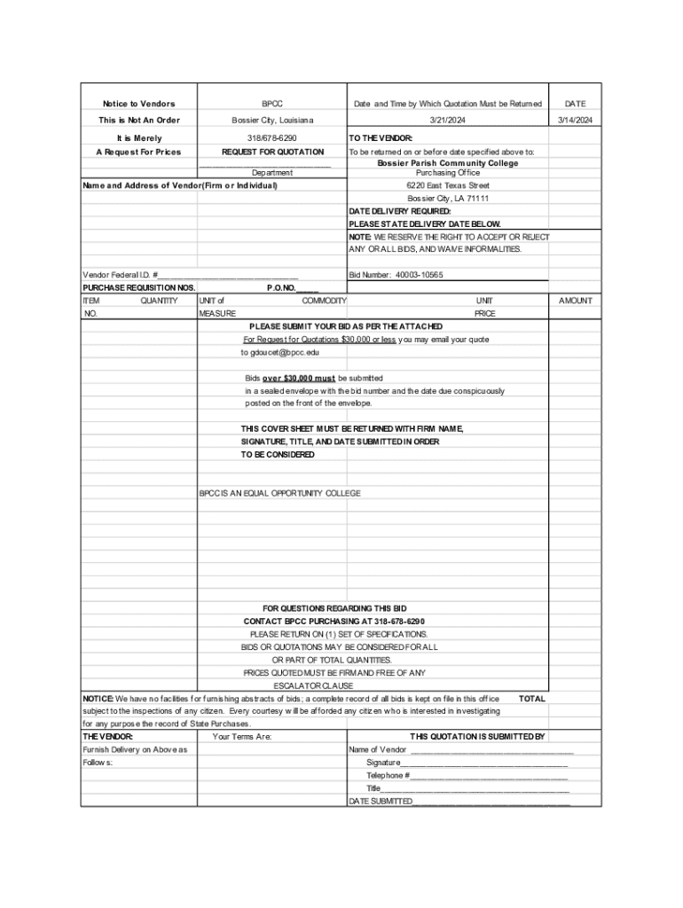 Notice to VendorsBPCCDate and Time by Which Quotation Must be ReturnedDATEThis is Not An OrderBossier City, Louisiana3/21/20243/14/2024It is Merely