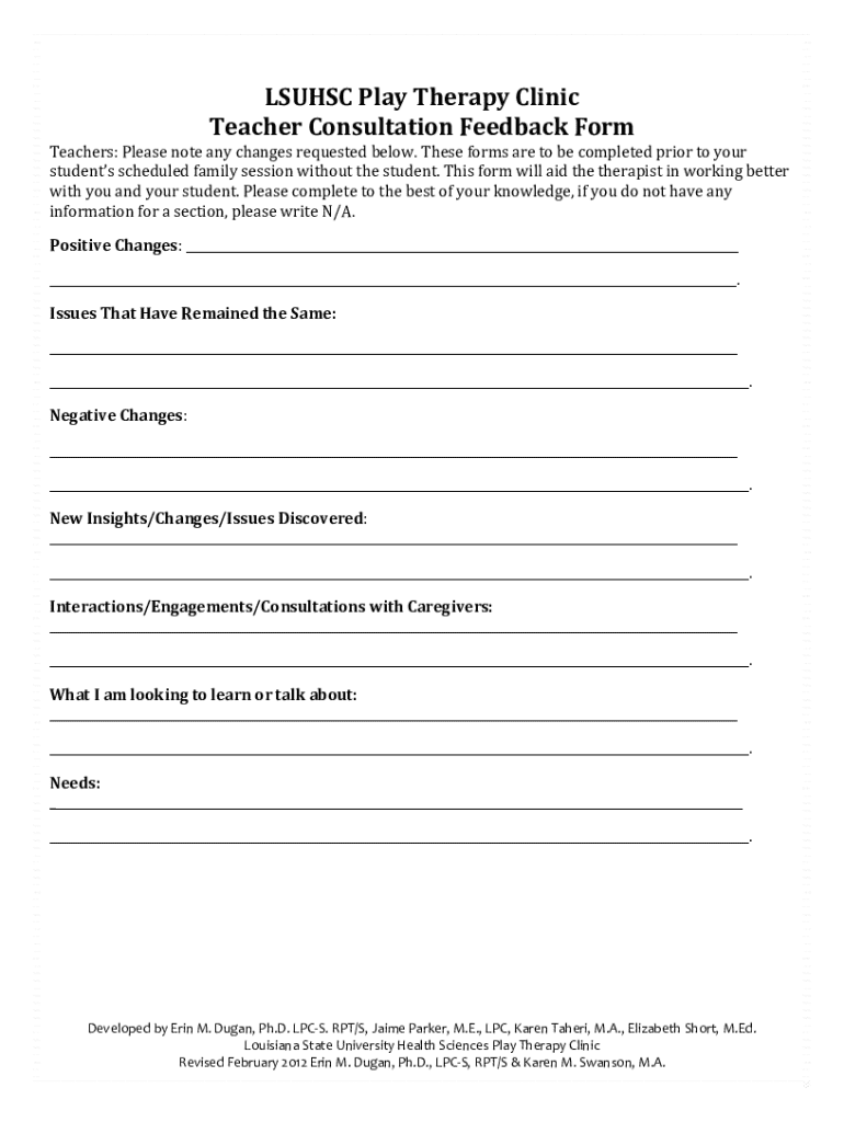 LSUHSC Play Therapy ClinicTeacher Consultation Feedback FormTeachers: Please note any changes requested below. These forms are to be completed prior to yourstudents scheduled family session without