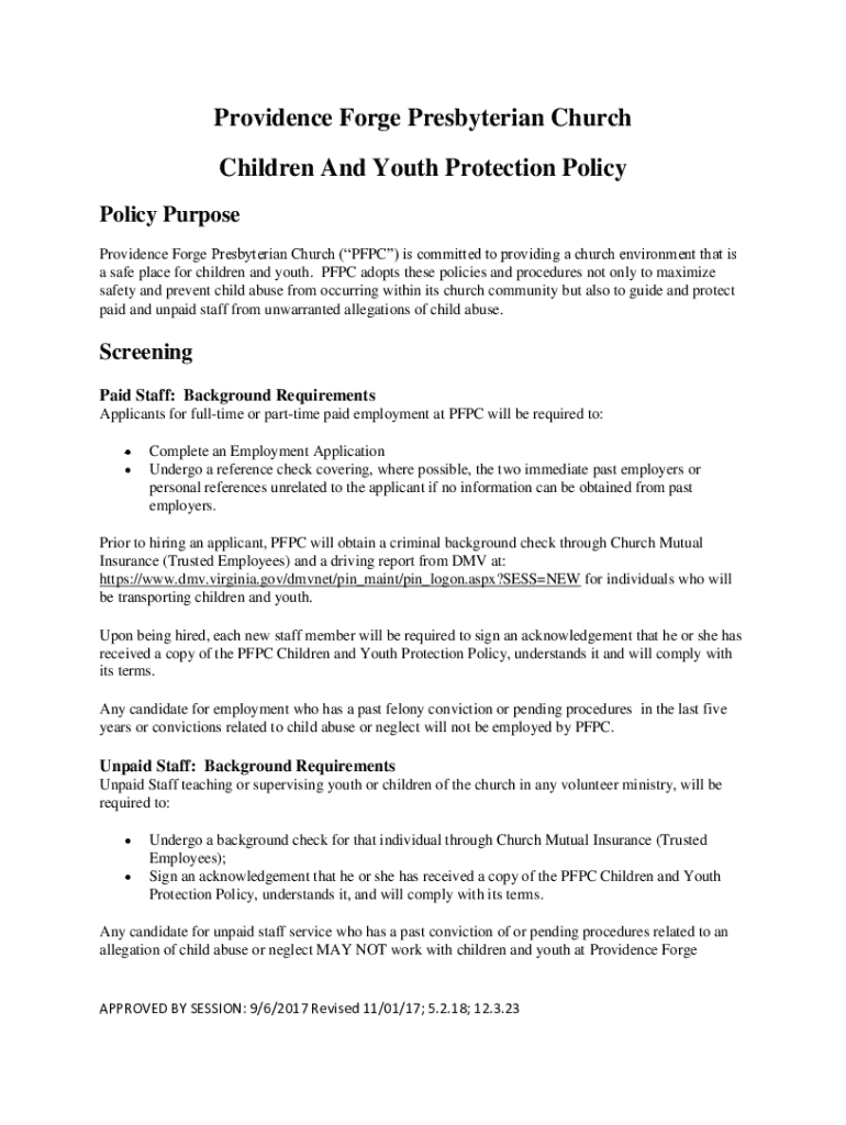 Providence Forge Presbyterian Church Children And Youth Protection Policy Policy Purpose Providence Forge Presbyterian Church (PFPC) is committed to providing a church environment that is a safe place