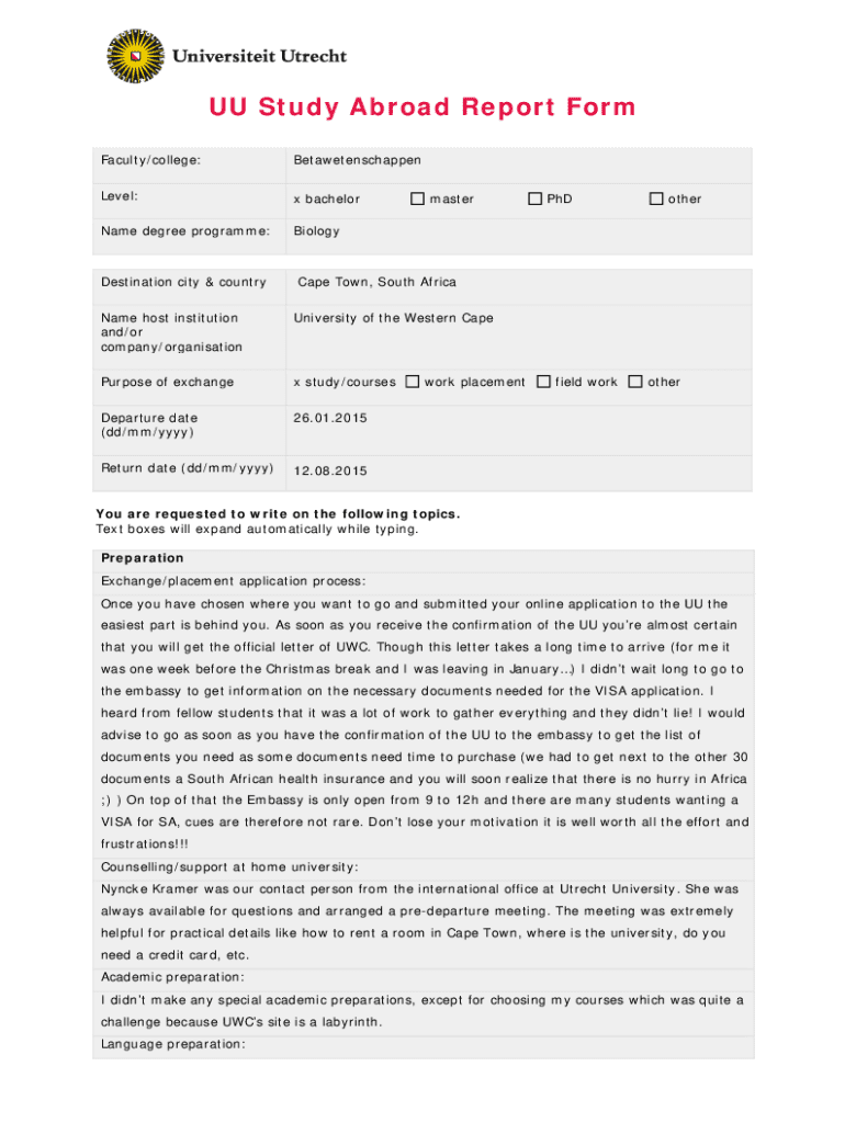 UU Study Abroad Report Form Faculty/college:BetawetenschappenLevel:x bachelorName degree programme:BiologyDestination city & countrymasterPhDotherCape Town, South AfricaName host institution and/or