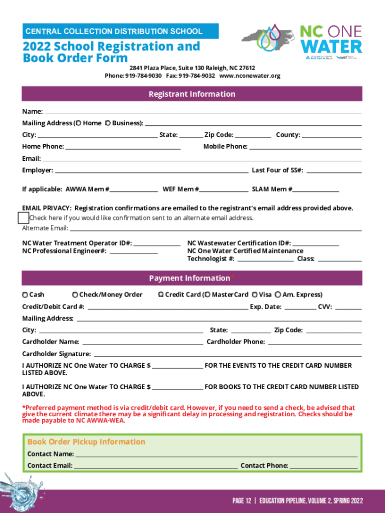 CENTRAL COLLECTION DISTRIBUTION SCHOOL2022 School Registration and Book Order Form2841 Plaza Place, Suite 130 Raleigh, NC 27612 Phone: 9197849030 Fax: 9197849032 www.nconewater.orgRegistrant Information