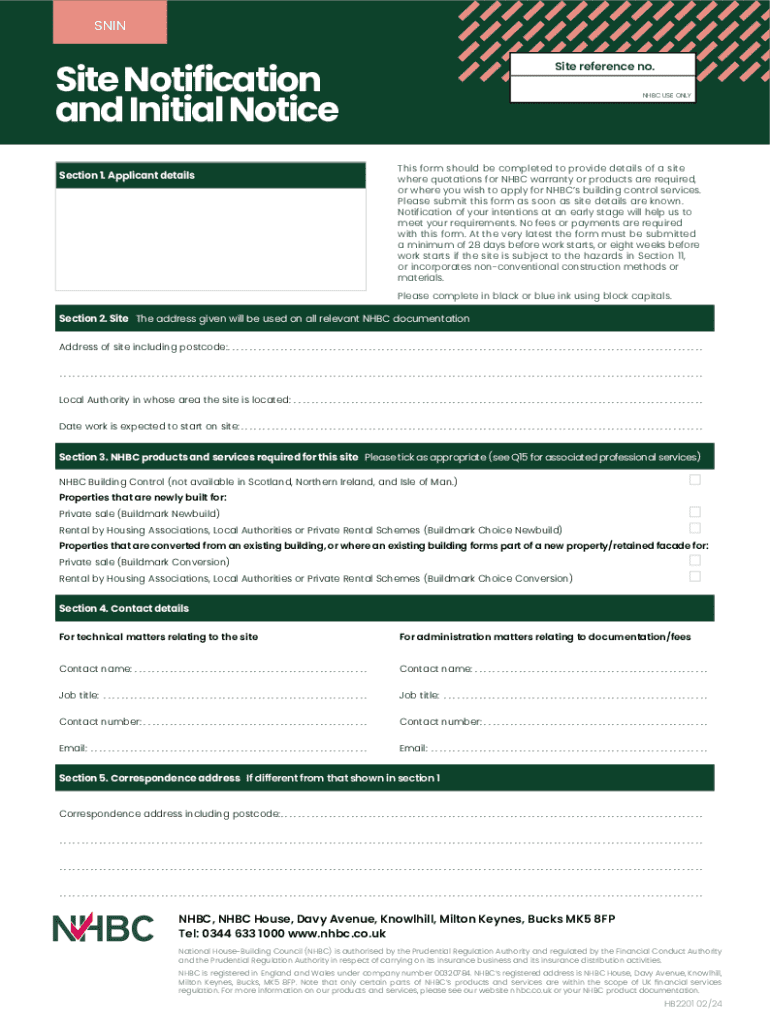 SNINSite Notification and Initial Notice Section 1. Applicant detailsSite reference no. NHBC USE ONLYThis form should be completed to provide details of a site where quotations for NHBC warranty or