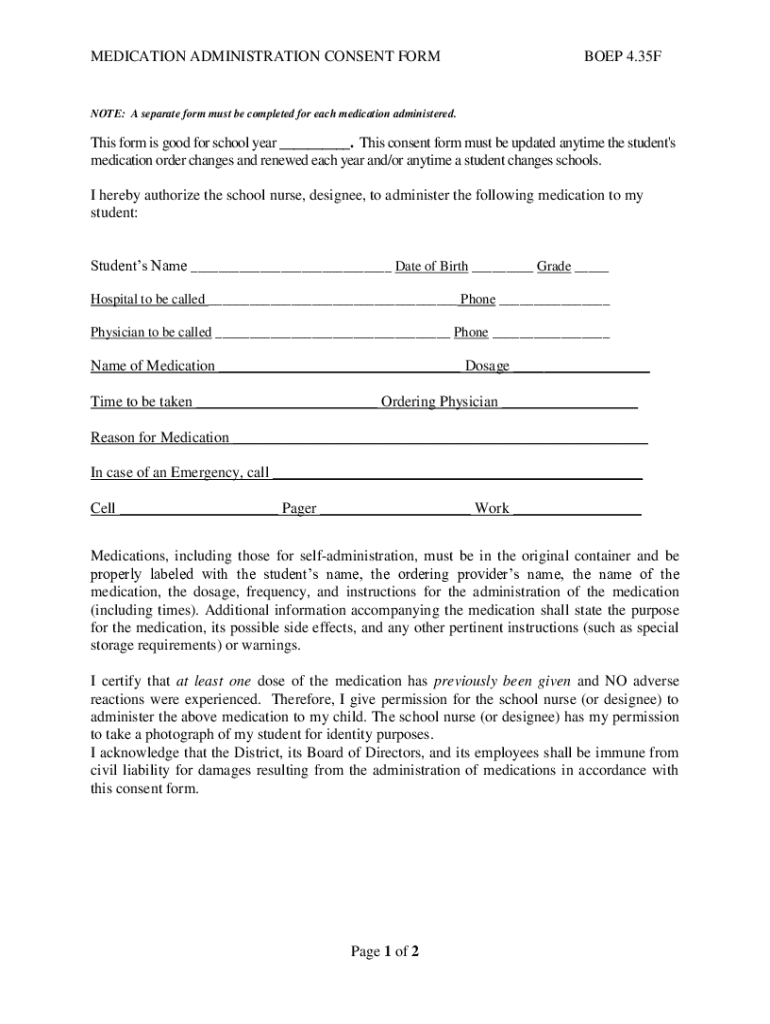 MEDICATION ADMINISTRATION CONSENT FORMBOEP 4.35FNOTE: A separate form must be completed for each medication administered.This form is good for school year ___. This consent form must be updated anytime