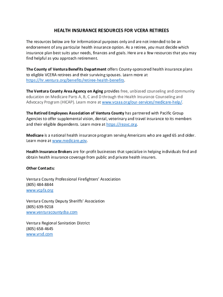 HEALTH INSURANCE RESOURCES FOR VCERA RETIREES The resources below are for informational purposes only and are not intended to be an endorsement of any particular health insurance option. As a retiree,