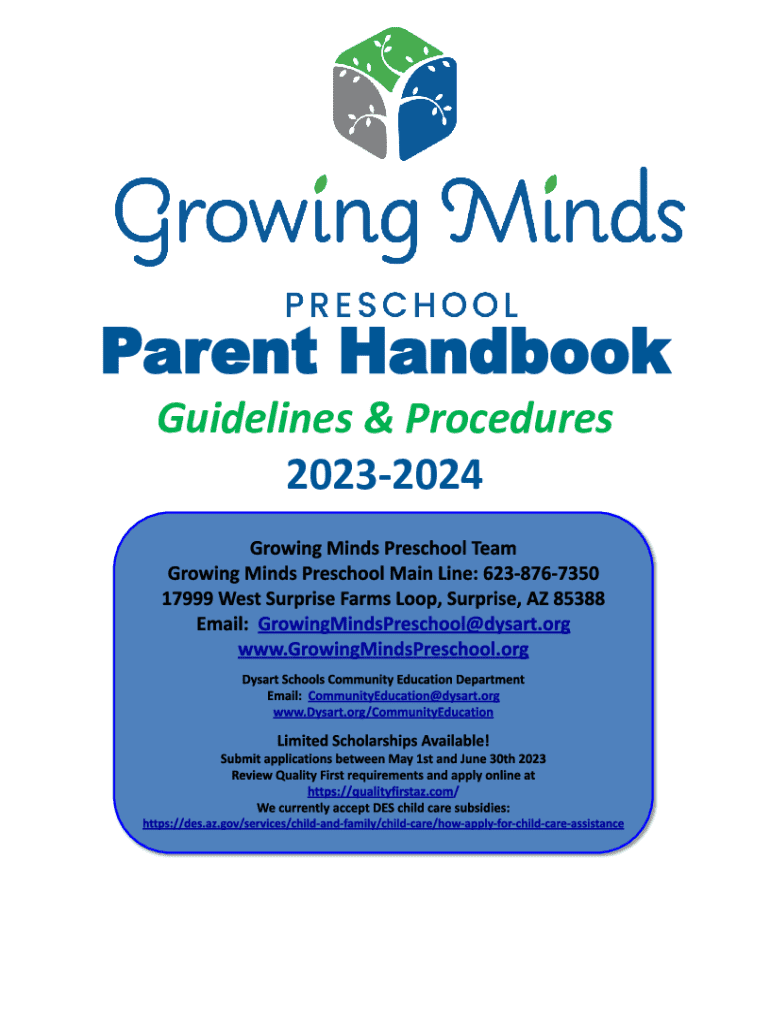 Parent Handbook Guidelines & Procedures 20232024Dear Growing Minds Preschool Family and Friends, Our early childhood experience will expose young minds to an environment that is fun and exciting,