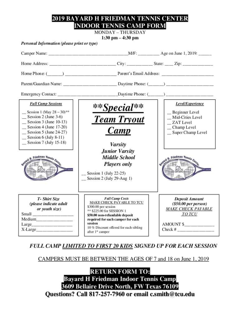 2019 BAYARD H FRIEDMAN TENNIS CENTER INDOOR TENNIS CAMP FORM MONDAY THURSDAY 1:30 pm 4:30 pm Personal Information (please print or type) Camper Name: ___M/F: ___ Age on June 1, 2019: ___ Home Address: