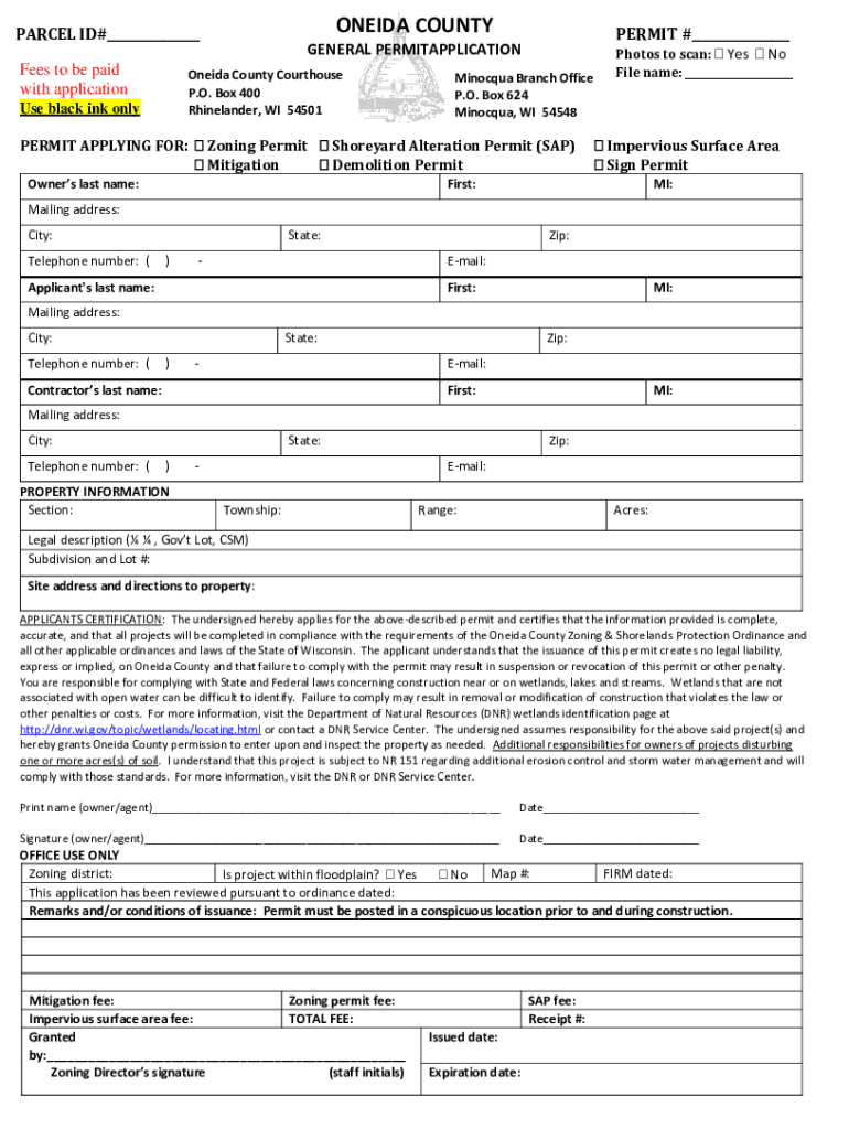 ONEIDA COUNTYPARCEL ID#___ Fees to be paid with applicationOneida County Courthouse P.O. Box 400 Rhinelander, WI 54501Use black ink onlyPERMIT #___GENERAL PERMITAPPLICATION Minocqua Branch Office