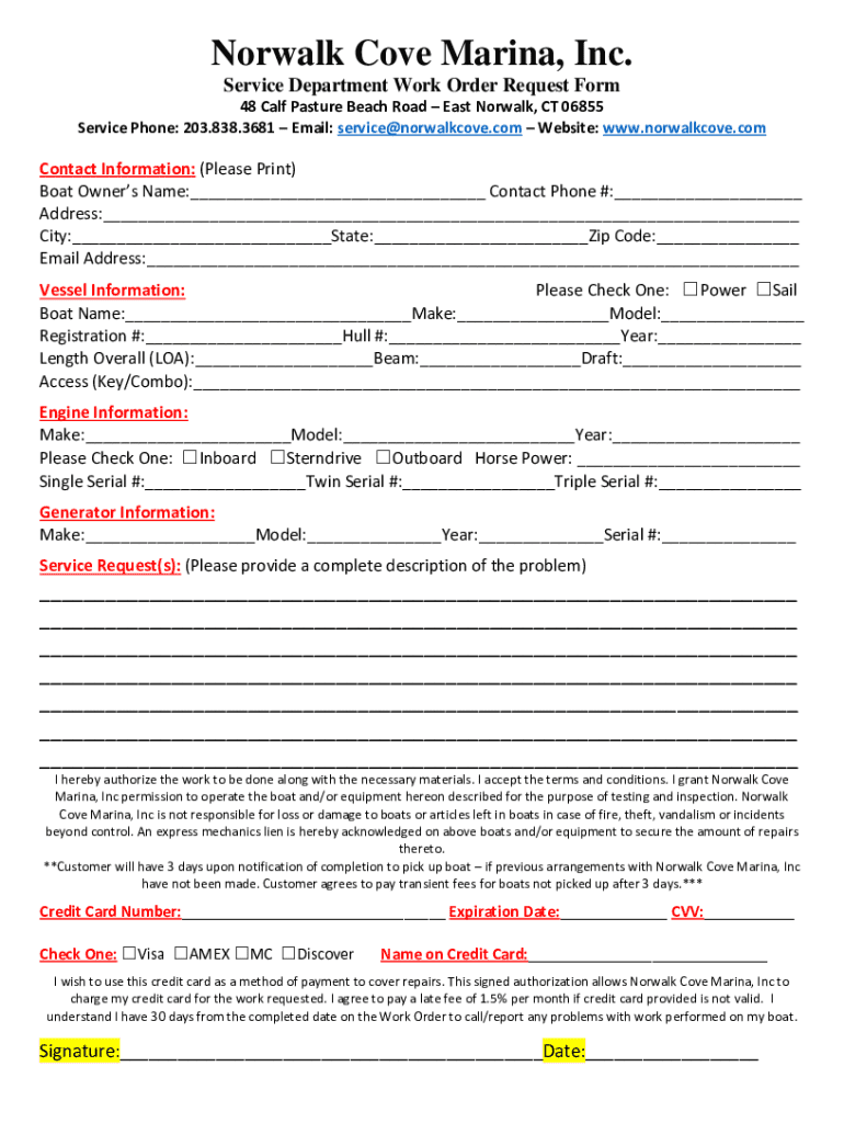 Obtain the necessary forms from Norwalk Cove Marina Inc.