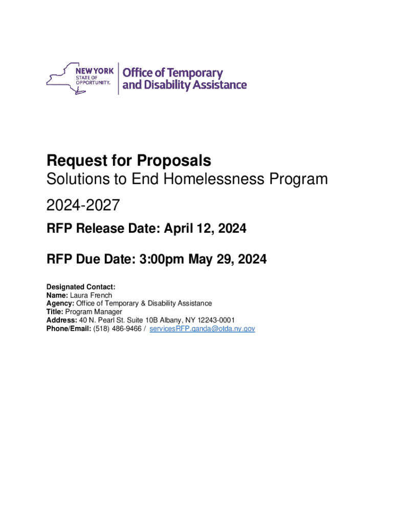 Request for Proposals Solutions to End Homelessness Program 20242027 RFP Release Date: April 12, 2024 RFP Due Date: 3:00pm May 29, 2024 Designated Contact: Name: Laura French Agency: Office of Temporary