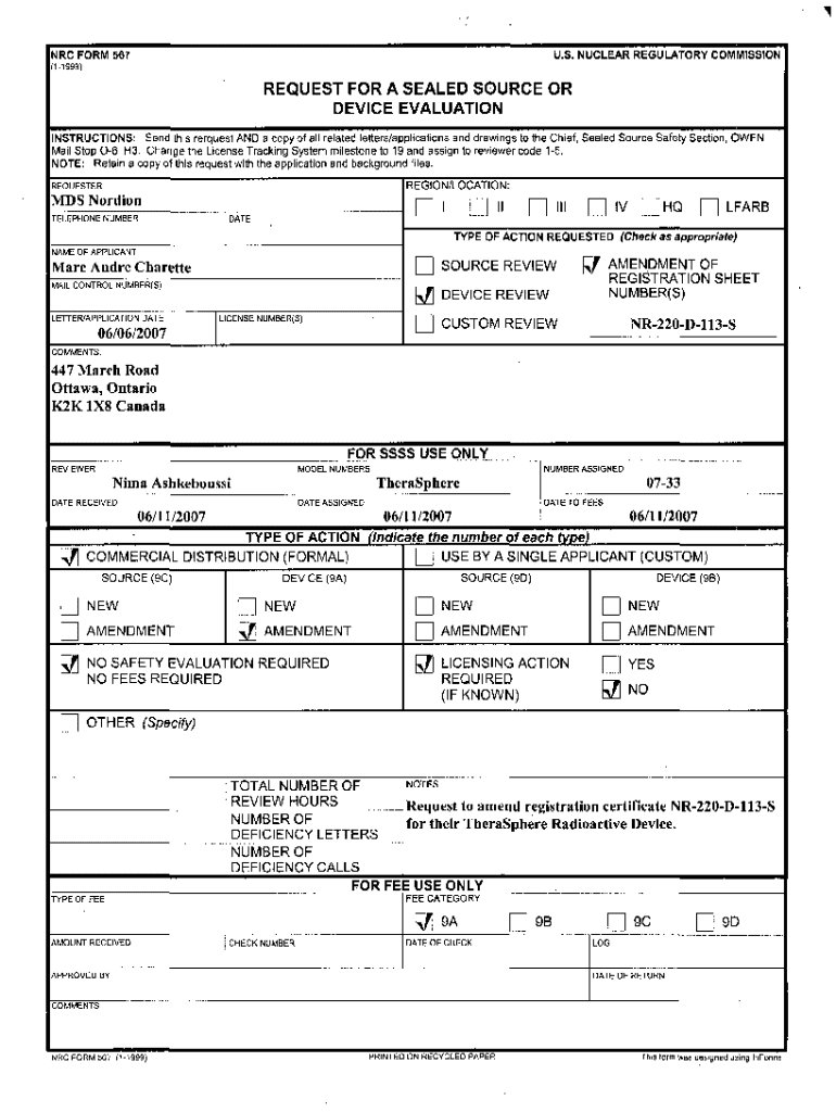 NRC FORM 567U. S. NUCLEAR REGULATORY COMMISSION(11999)REQUEST FOR A SEALED SOURCE OR DEVICE EVALUATION INSTRUCTIONS: Send this request AND a copy of all related letters/applications and drawings to