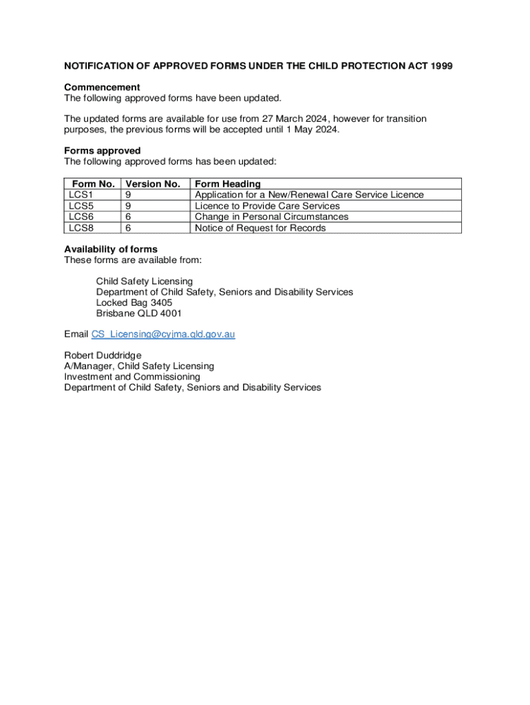 NOTIFICATION OF APPROVED FORMS UNDER THE CHILD PROTECTION ACT 1999