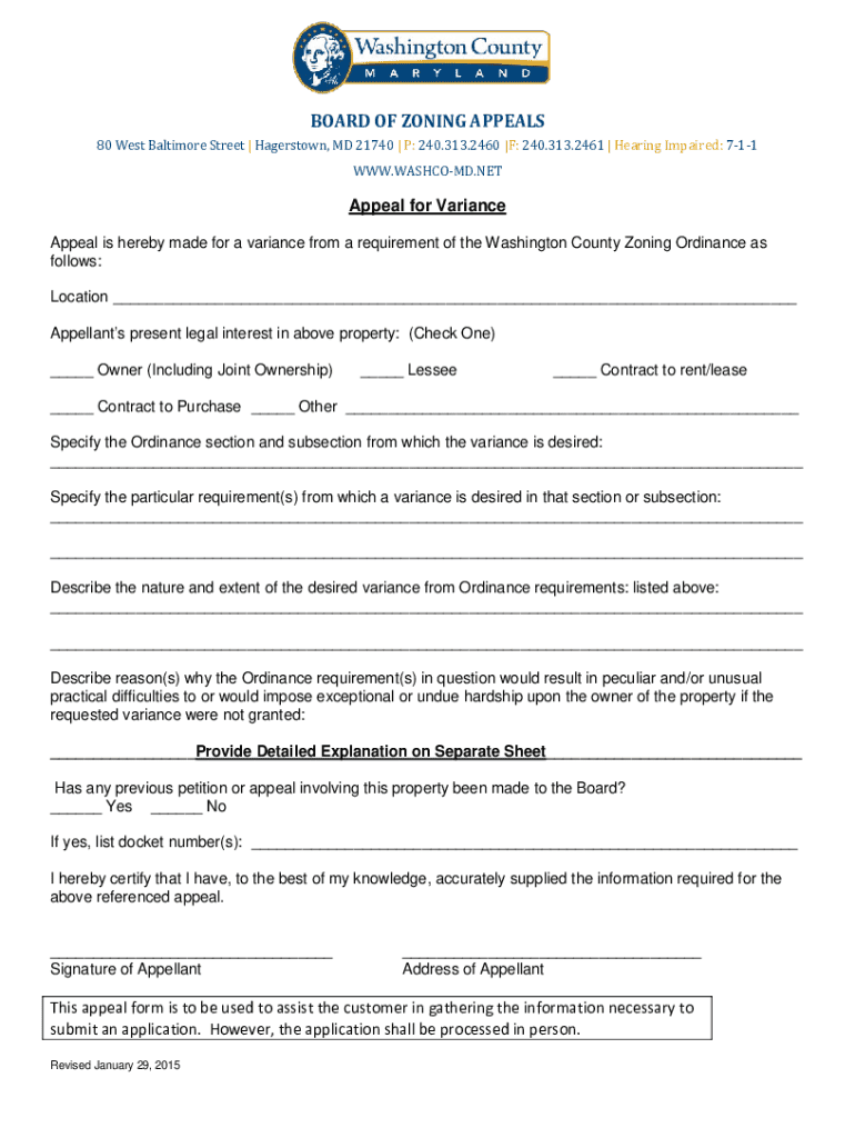 BOARD OF ZONING APPEALS 80 West Baltimore Street | Hagerstown, MD 21740 | P: 240.313.2460 |F: 240.313.2461 | Hearing Impaired: 711 WWW.WASHCOMD.NETAppeal for Variance Appeal is hereby made for a variance