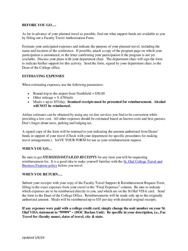 BEFORE YOU GO. As far in advance of your planned travel as possible, find out what support funds are available to you by filling out a Faculty Travel Authorization Form. Estimate your anticipated