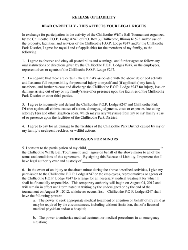 RELEASE OF LIABILITY READ CAREFULLY THIS AFFECTS YOUR LEGAL RIGHTS In exchange for participation in the activity of the Chillicothe Waffle Ball Tournament organized by the Chillicothe F.O.P. Lodge
