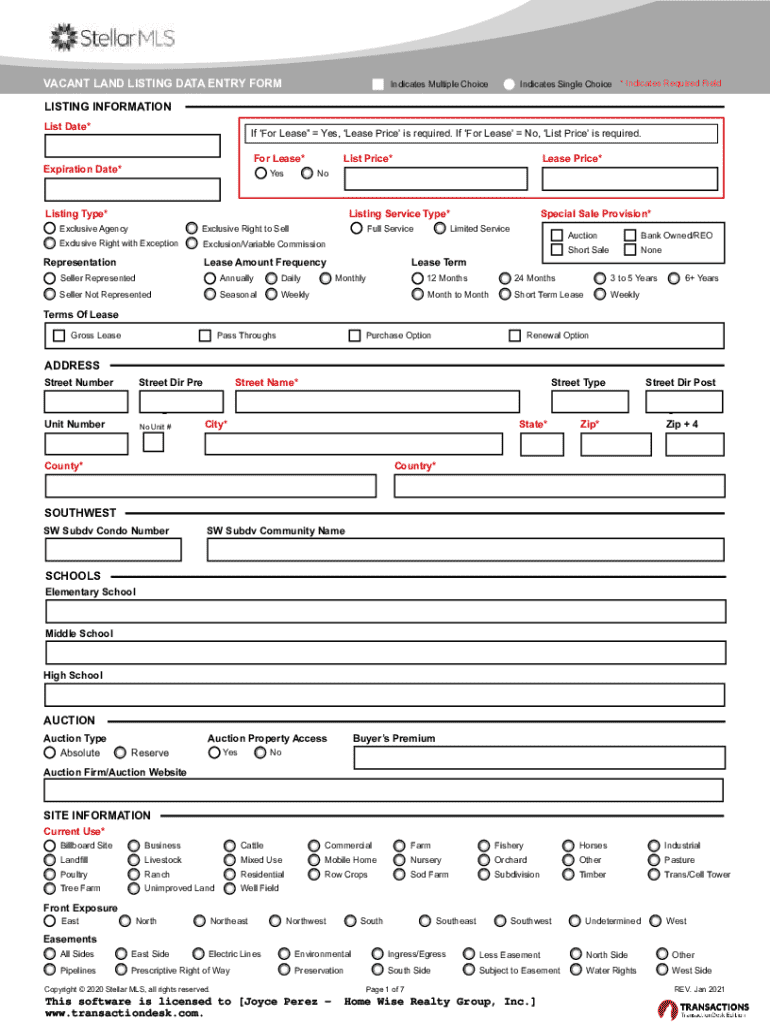 VACANT LAND LISTING DATA ENTRY Fornicates Single Choice * Indicates Required FieldIndicates Multiple Whitelisting INFORMATION