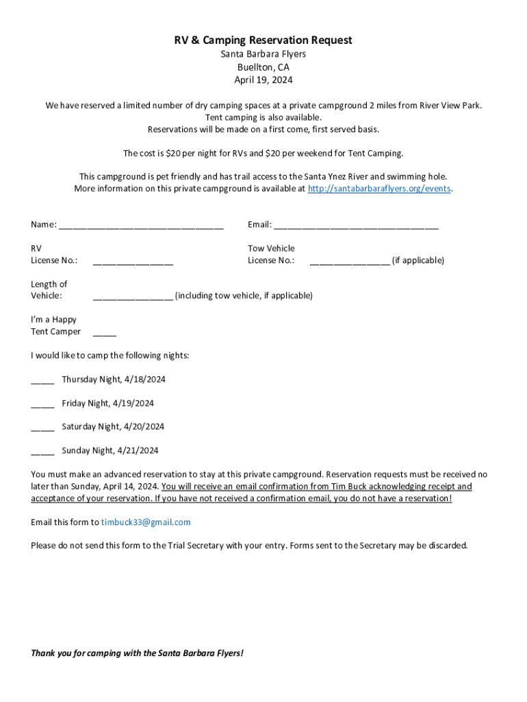 RV & Camping Reservation Request Santa Barbara Flyers Bullion, CA April 19, 2024, We have reserved a limited number of dry camping spaces at a private campground 2 miles from River View Park. Tent