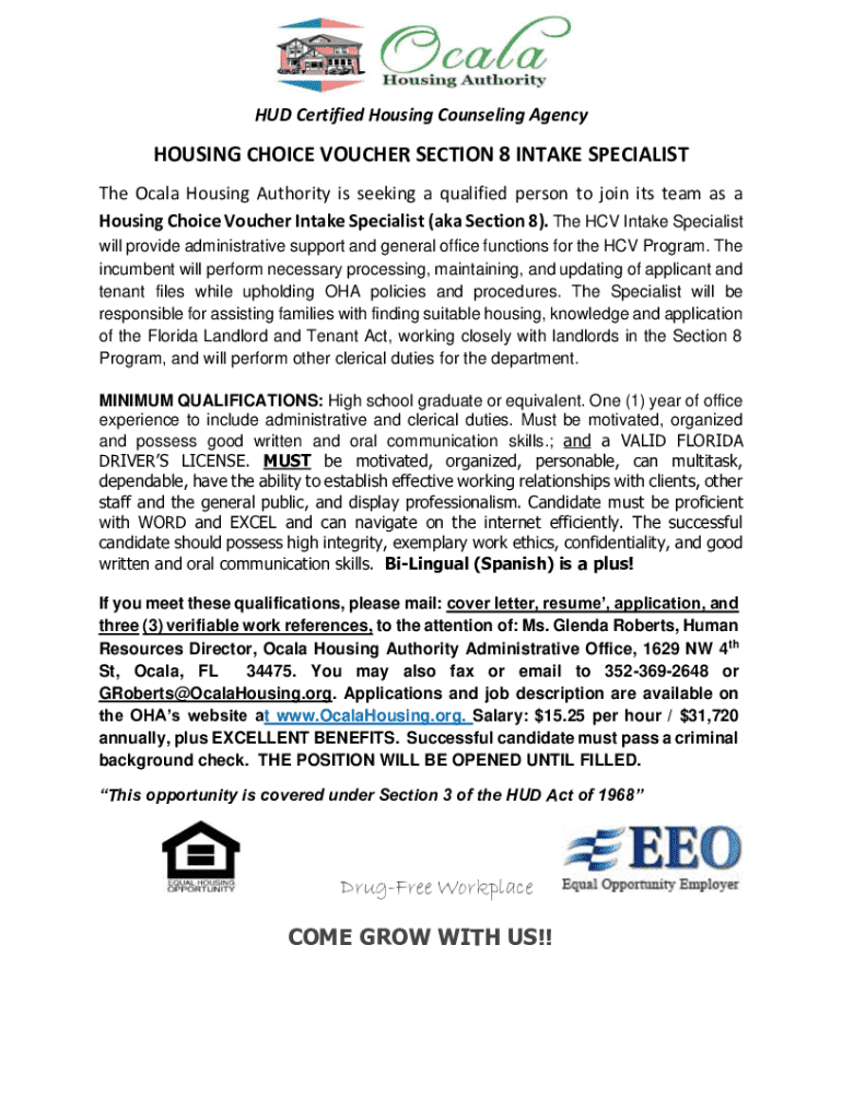 HUD Certified Housing Counseling AgencyHOUSING CHOICE VOUCHER SECTION 8 INTAKE SPECIALIST The Ocala Housing Authority is seeking a qualified person to join its team as a Housing Choice Voucher Intake