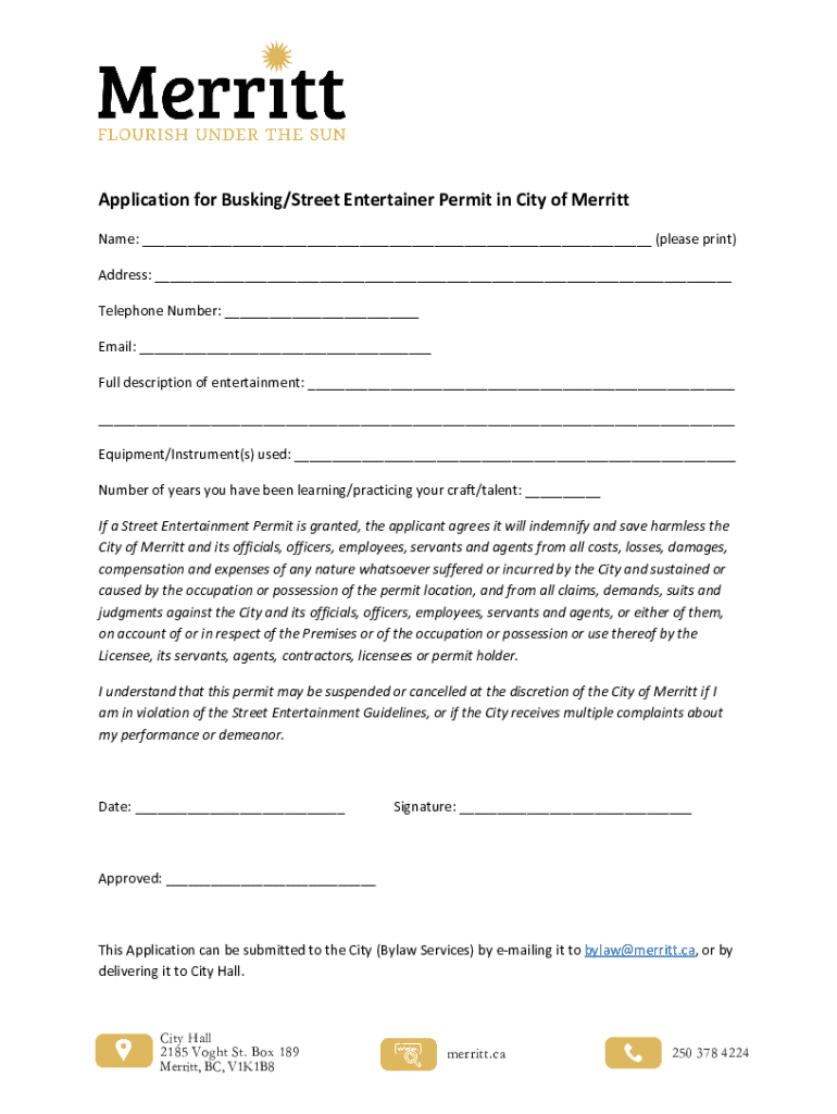 Application for Busking/Street Entertainer Permit in City of Merritt Name: ___ (please print) Address: ___ Telephone Number: ___ Email: ___ Full description of entertainment: ___ ___ Equipment/Instrument(s)