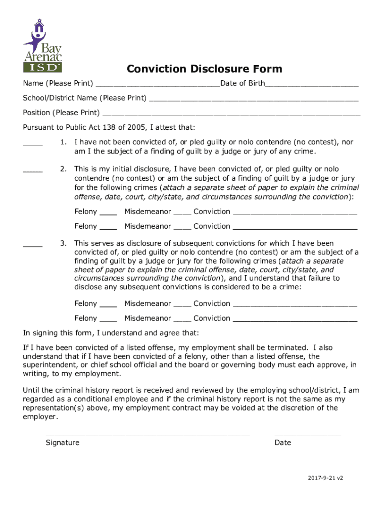 Conviction Disclosure Form Name (Please Print) ___Date of Birth___ School/District Name (Please Print) ___ Position (Please Print) ___ Pursuant to Public Act 138 of 2005, I attest that: 1.I have not