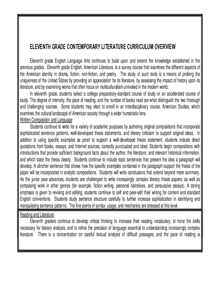 ELEVENTH GRADE CONTEMPORARY LITERATURE CURRICULUM OVERVIEW Eleventh grade English Language Arts continues to build upon and extend the knowledge established in the previous grades. Eleventh grade