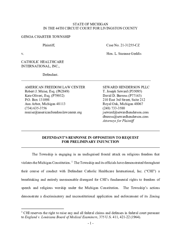 Plaintiff, Case No. 2131255CZv. Hon. L. Suzanne GeddisCATHOLIC HEALTHCARE