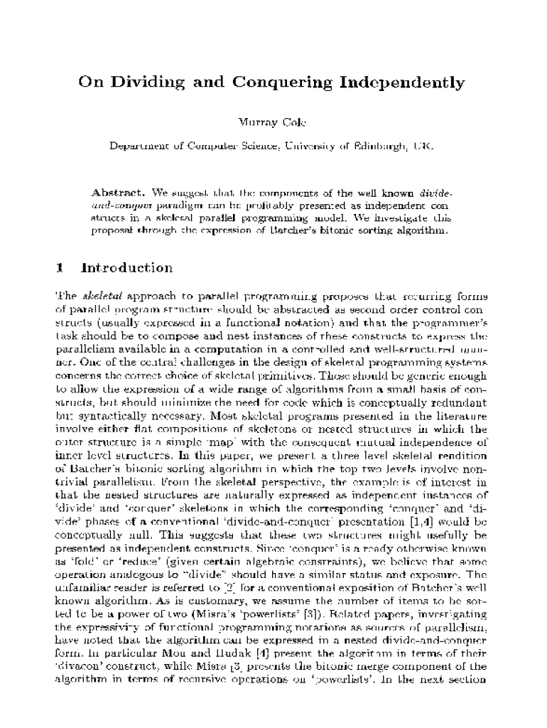 On Dividing and Conquering Independently Murray Cole Department of Computer Science, University of Edinburgh, UK. A b s t r a c t. We suggest that the components of the well known divideandconquer