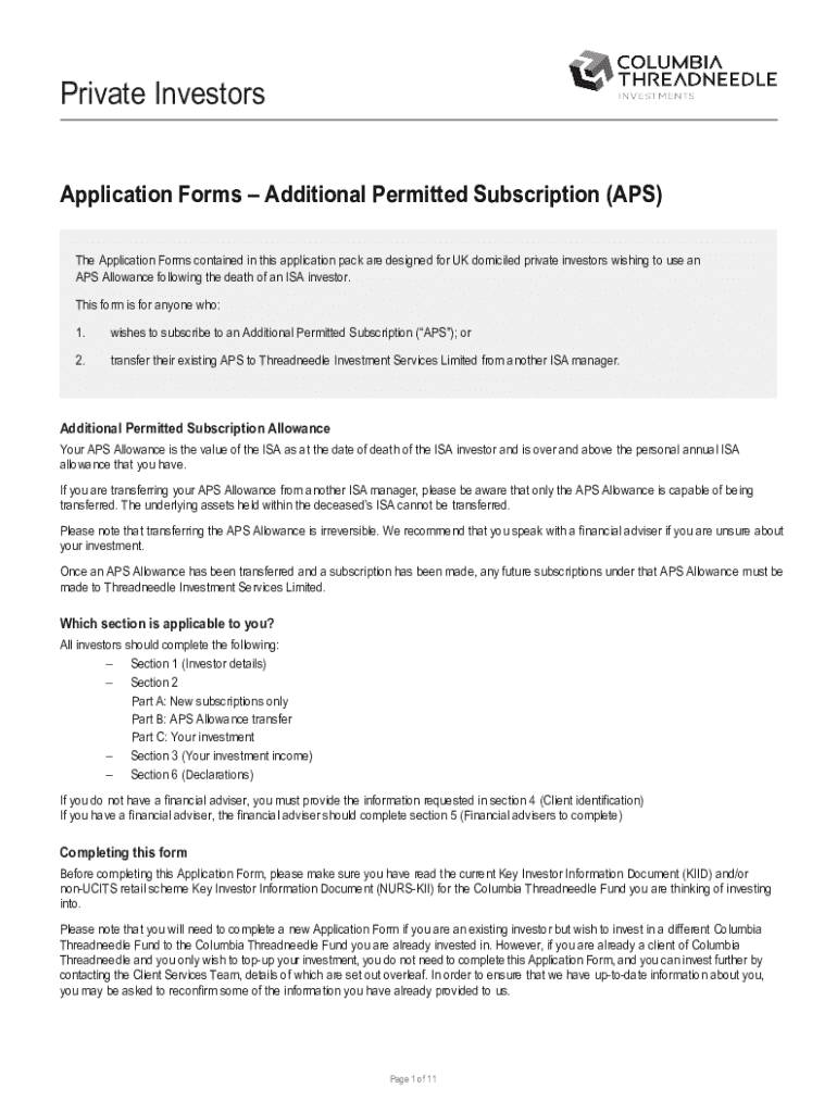Private Investors Application Forms Additional Permitted Subscription (APS) The Application Forms contained in this application pack are designed for UK domiciled private investors wishing to use