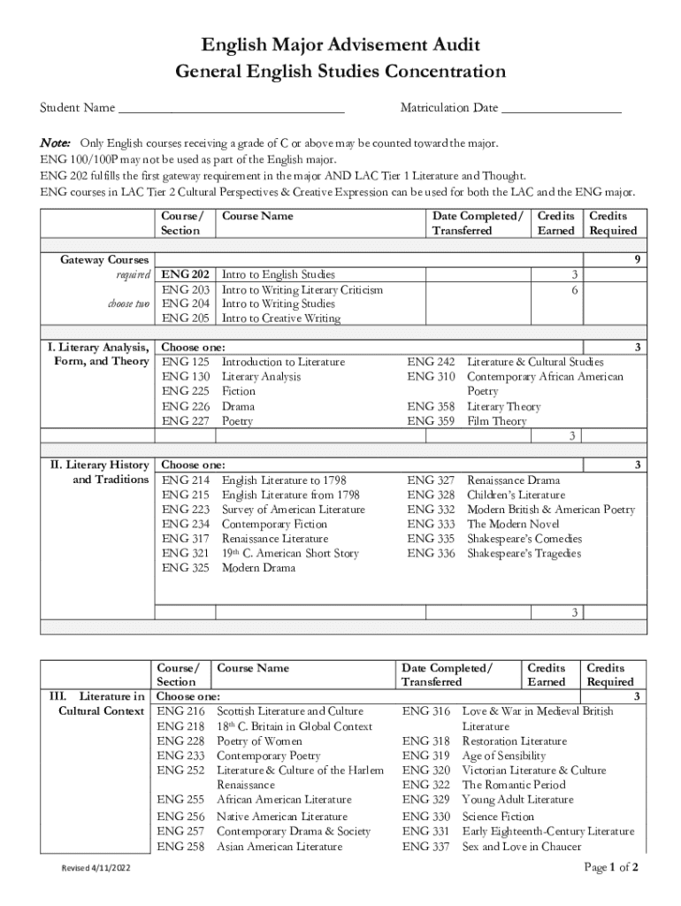 Student Name ___Matriculation Date ___Note: Only English courses receiving a grade of C or above may be counted toward the major.