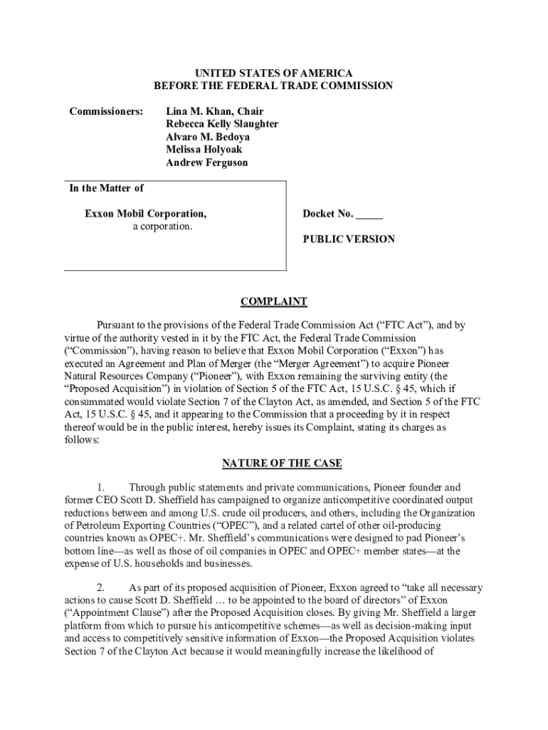 UNITED STATES OF AMERICA BEFORE THE FEDERAL TRADE COMMISSION Commissioners:Lina M. Khan, Chair Rebecca Kelly Slaughter Alvaro M. Bedoya Melissa Holyoak Andrew FergusonIn the Matter of Exxon Mobil