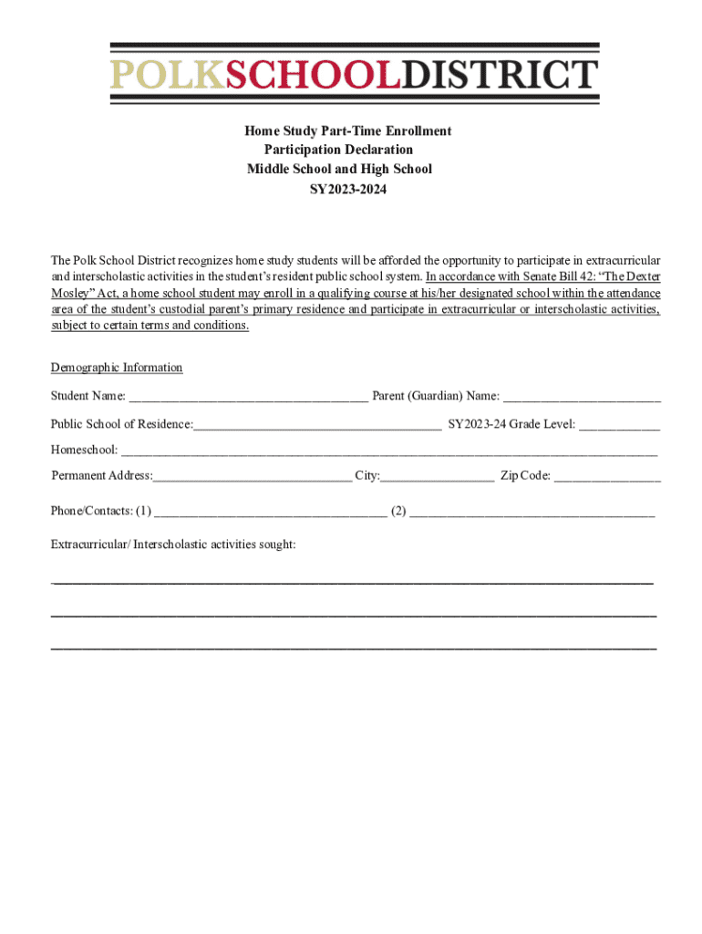 Home Study PartTime Enrollment Participation Declaration Middle School and High School SY20232024The Polk School District recognizes home study students will be afforded the opportunity to participate