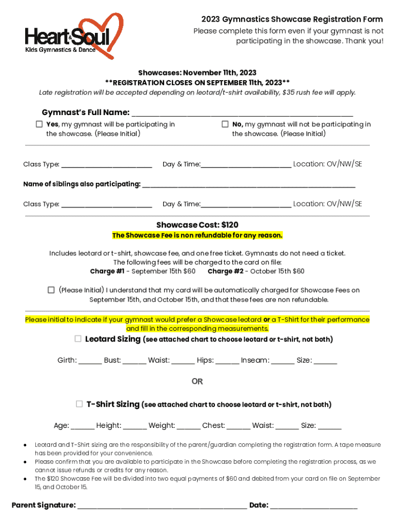 2023 Gymnastics Showcase Registration Form Please complete this form even if your gymnast is not participating in the showcase. Thank you! Showcases: November 11th, 2023 **REGISTRATION CLOSES ON SEPTEMBER